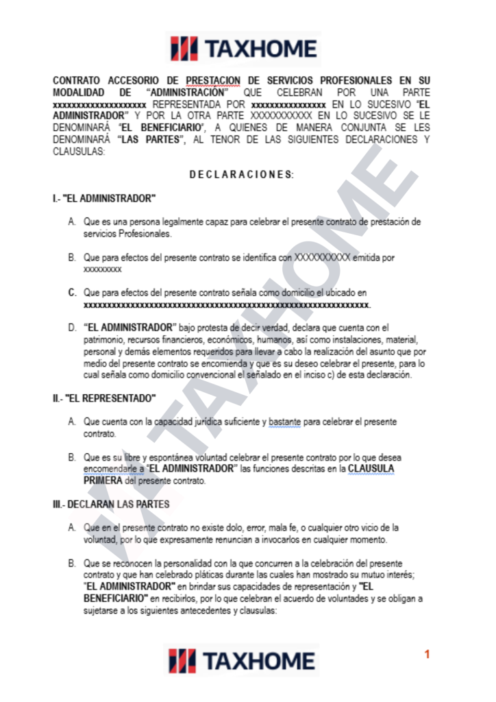 Este contrato establece que el Administrador prestará servicios profesionales para gestionar un inmueble del Beneficiario, incluyendo la recepción de pagos de renta y la gestión de servicios relacionados. El Administrador actuará conforme a la ley, sin asumir ninguna responsabilidad por acciones ilegales solicitadas por el Beneficiario. El Beneficiario se compromete a pagar al Administrador un 10% de los ingresos generados por el arrendamiento.