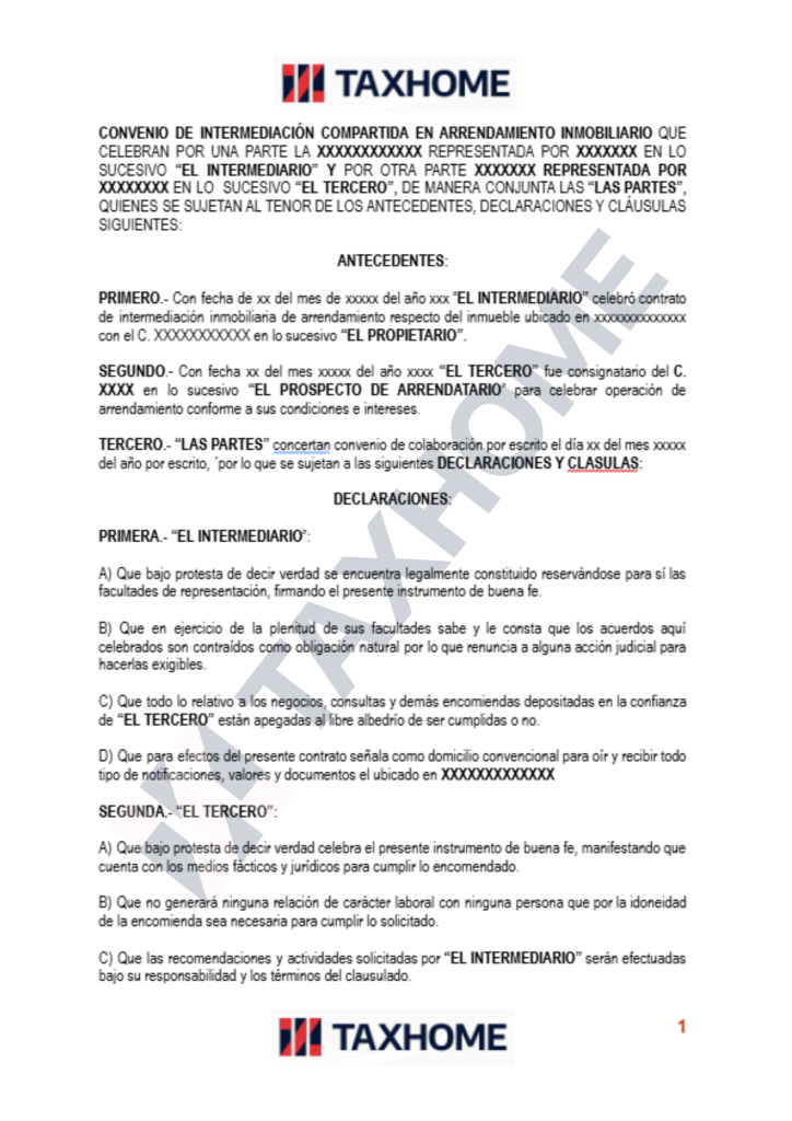 Este convenio establece un acuerdo de intermediación compartida entre un intermediario inmobiliario («EL INTERMEDIARIO») y un tercero («EL TERCERO») para la gestión de arrendamientos inmobiliarios.