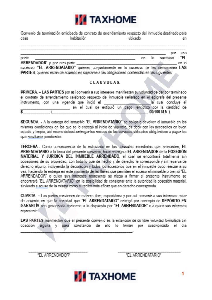 Este convenio establece la terminación anticipada del contrato de arrendamiento de un inmueble destinado para casa habitación. Ambas partes acuerdan dar por concluido el contrato previo, cuya vigencia y condiciones se especifican en el documento, incluyendo el monto de la renta mensual pactada.